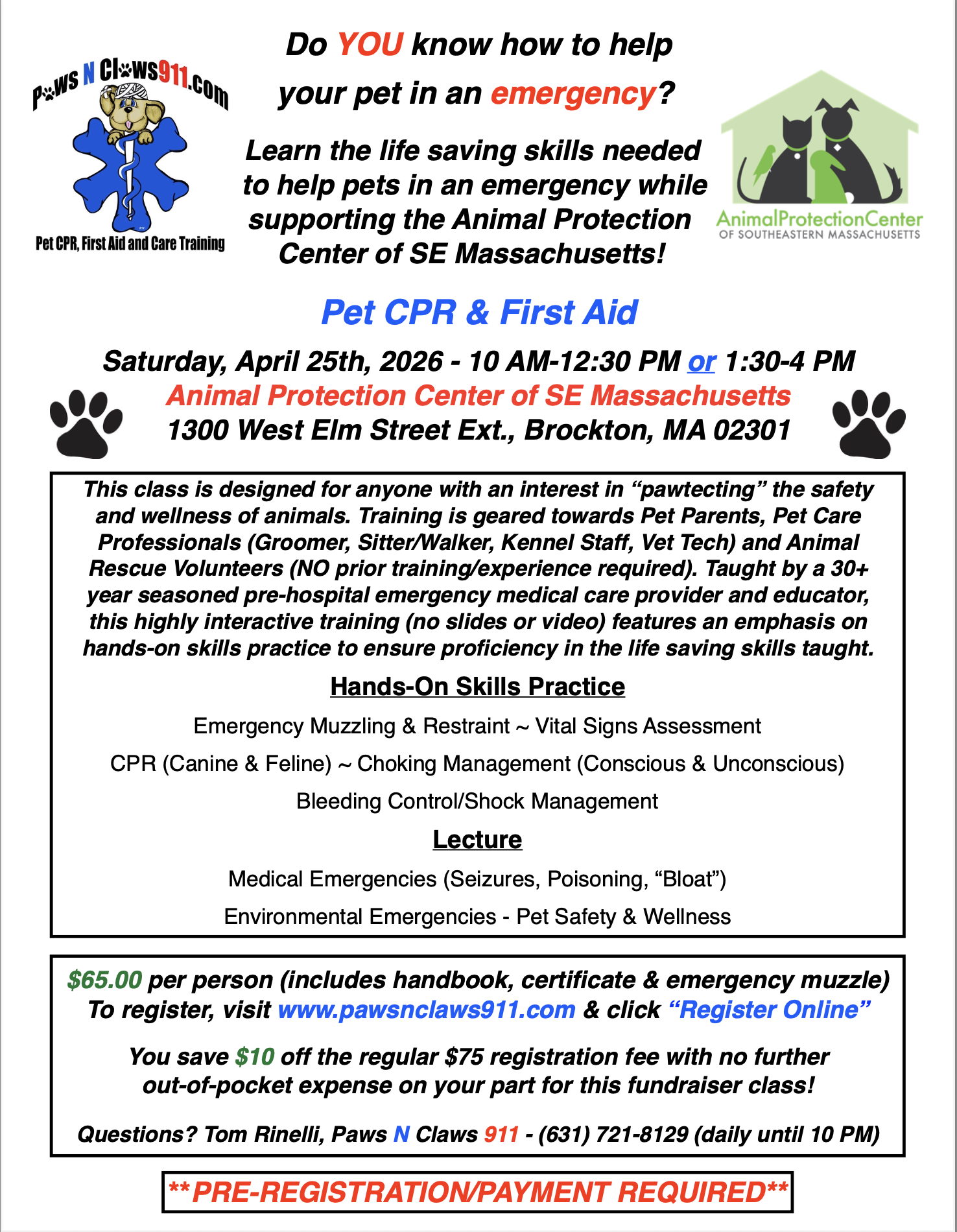 Register for 10 AM class: https://www.pawsnclaws911.com/.../pet-cpr-first-aid-3-23...